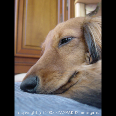 しかし、ふと顔を覗くと・・・おイヌさま、お鼻が曲がっていますよ~。いつもこのお鼻の柔らかさに驚きます。床に押し付けてふむふむと匂いを嗅いでいる時など、左右上下に自由に曲がり、見ていて「クスッ」と笑ってしまいます。