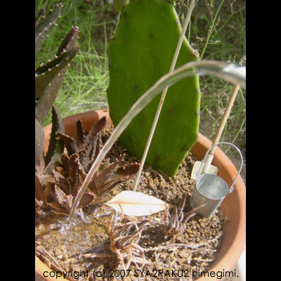 冬のうちは茶色くなってシナシナとしていたのですが、この頃の天気と水遣りに後押しされてか、ぐんぐん緑色の新芽が伸びてきています。サボテンさんも頭のてっぺんに新しい腕をニョッキと出してきたし、アロエもどきさん(本当の名前が分からないのです。アロエっぽく見えるので、相方と呼ぶときは「アロエもどきさん」と呼んでいます。)も子分を周りに引き連れてきました。