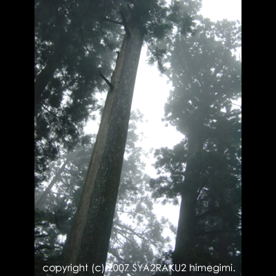 小雨の降る中を見学させていただいたのですが、霧の中に建物や杉の巨木たちが佇んでいて、なんとも幽玄でした。