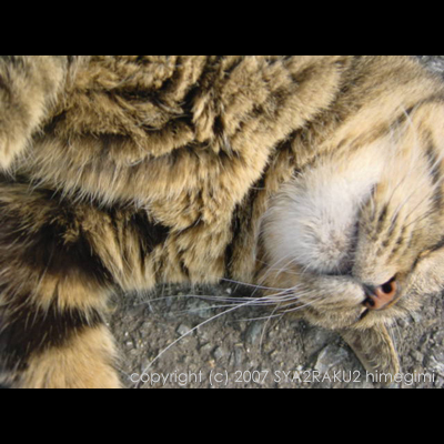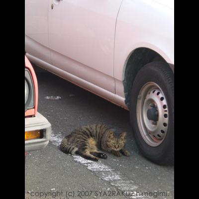 実家に向かってポチポチ歩いていると、前方の駐車場に昼寝をしているニャンコさまを発見。最初は近寄ったら逃げちゃうかなぁ、と思い控えめに写真を撮っていたのですが、ニャンコさまの方から接近。